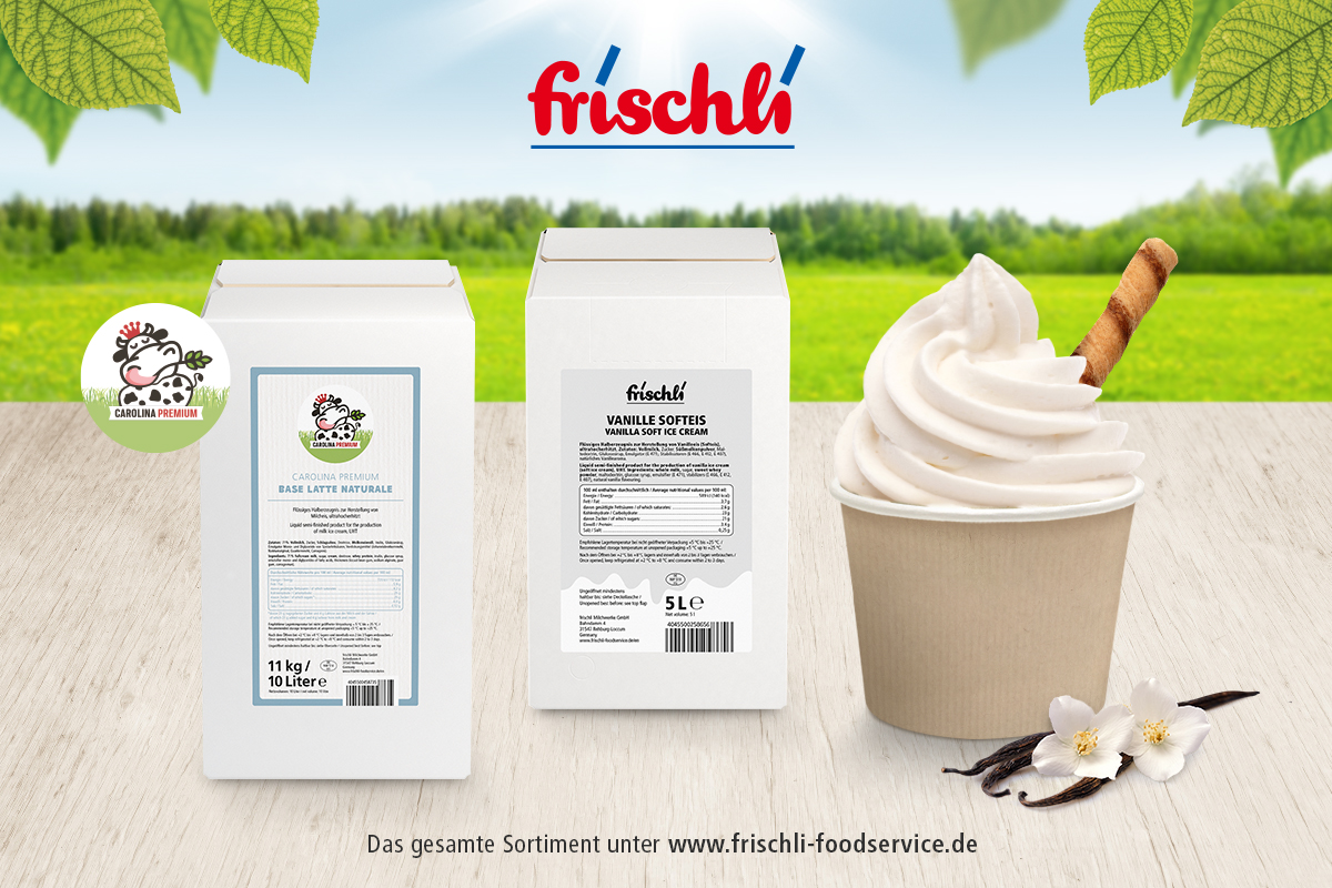 Die frischli Milchwerke bieten Bäckereien und Eisdielen, Großverbrauchern wie Betriebsrestaurants und anderen Eis-interessierten Kunden der Foodservice-Branche gelingsichere und hochwertige Eis-Basen für die Zubereitung von Streicheis und Softeis