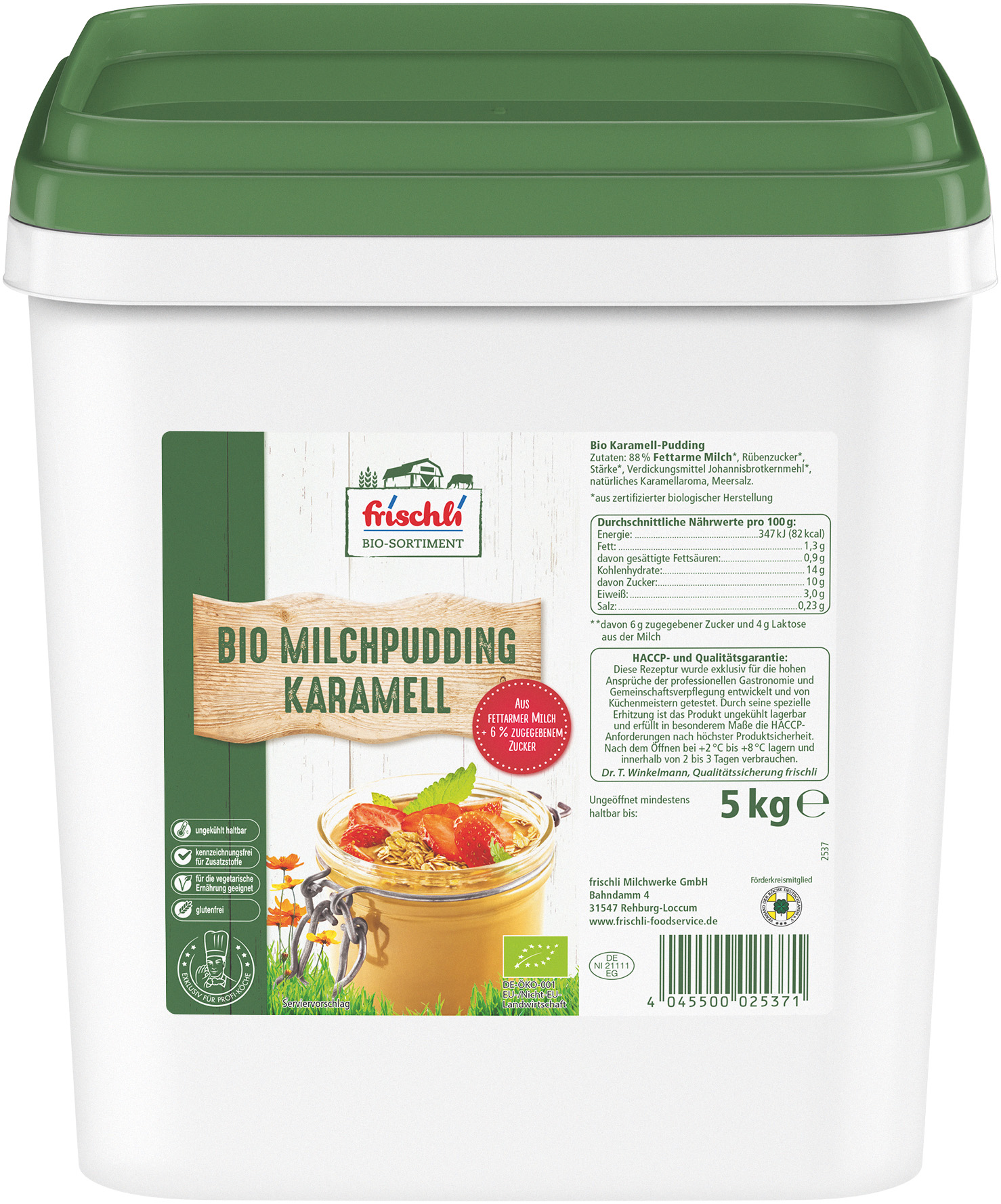 Der Bio-Milchpudding Karamell ist für die vegetarische Ernährung geeignet, glutenfrei und kennzeichnungsfrei für Zusatzstoffe. Er kann im ungeöffneten Zustand ungekühlt gelagert werden und wird im benutzerfreundlichen, frischeversiegelten Eimer mit wiederverschließbarem Deckel angeboten.