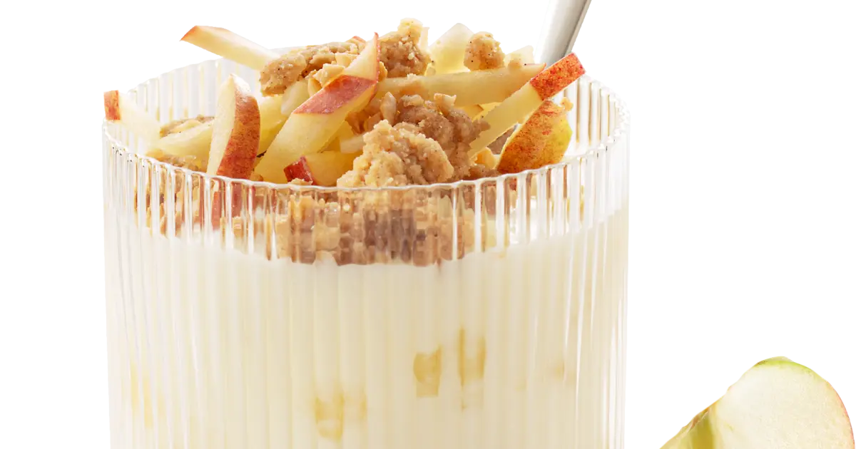 - frischli Jubiläumsdessert Typ Apfelkuchen in Gläser portionieren. Mit dem Apfelsalat und Zimt-Streuseln dekorieren.